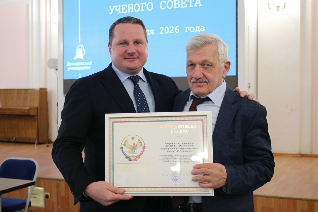 Декану факультета психологии ЯрГУ Анатолию Карпову вручено Благодарственное письмо в адрес факультета за большой вклад в подготовку научно-педагогических кадров Республики Дагестан, а также в связи с 55-летним юбилеем факультета и 30-летним юбилеем Диссертационного совета.